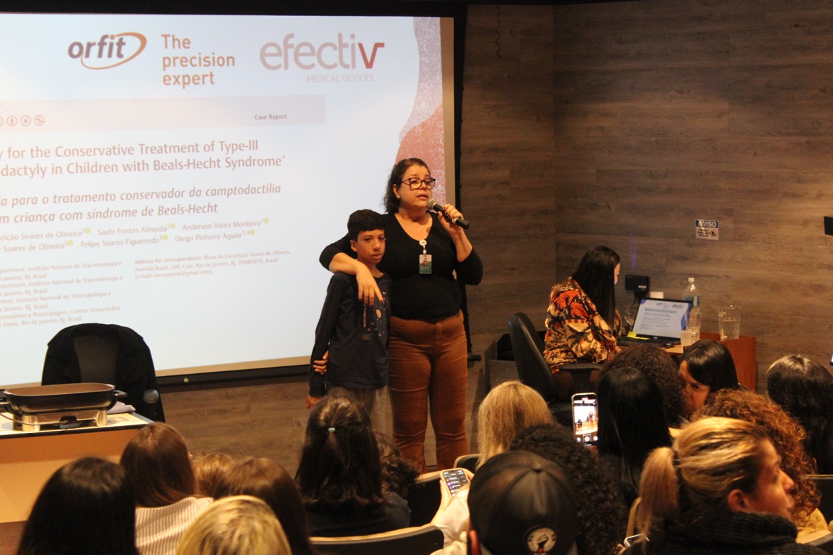 Especializada na área da terapia ocupacional que trabalha com deformidades congênitas de membros superiores, logo no começo da palestra, ela chamou à frente o paciente Cristian Lima, de 11 anos, que acompanha desde os 7 meses de vida.