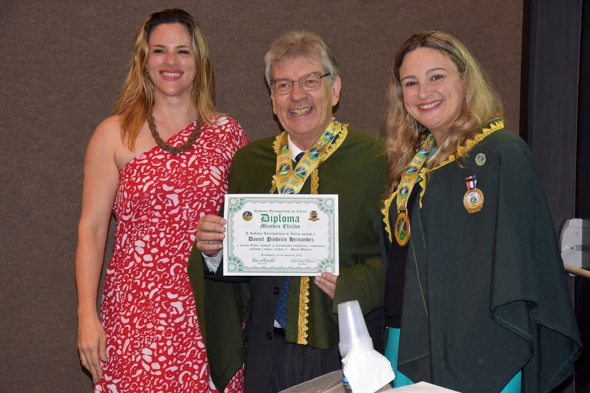 O Centro Universitário Serra dos Órgãos (Unifeso) sediou a cerimônia de posse dos novos acadêmicos da Academia Teresopolitana de Letras (ATL), realizada no dia 3 de março, no campus Antonio Paulo Capanema de Souza, no Alto. A ATL, que há 62 anos promove a cultura em Teresópolis, renova seu quadro de membros efetivos para manter viva a chama da cultura na cidade. Por este motivo, para fortalecer as atividades da academia, o professor Daniel Pinheiro Hernandez, do curso de Medicina do Unifeso, coordenador do Grupo de História (GHM) e do Programa de Literatura, Artes, Memória e Cinema (Plamc) foi empossado na ocasião. A acadêmica Claudia Coelho de Meneses, presidente da ATL, declarou que “é uma grande honra estarmos aqui no Unifeso” e convidou a todos a participarem das reuniões que acontecem na sede da ATL, na Várzea, e também nos espaços públicos, como a Casa de Cultura Adolpho Bloch. Aproximar os participantes do Plamc às atividades da ATL está entre os objetivos do professor Daniel Hernandez. “Estou no Unifeso há 50 anos, e aqui transformou-se em minha casa. Fiz vestibular, passei, aqui me formei, comecei a trabalhar no Unifeso e pretendo continuar por muito tempo. Convivi e convivo com gente fantástica, entre alunos e colegas professores, e por isso fiz questão que a posse fosse aqui e agradeço a todos por terem concordado”, declarou o professor Daniel, que assumiu a cadeira número 4 na ATL, tendo como o patrono o poeta Manuel Bandeira; e padrinho Delmo Ferreira, professor, escritor e jornalista.
