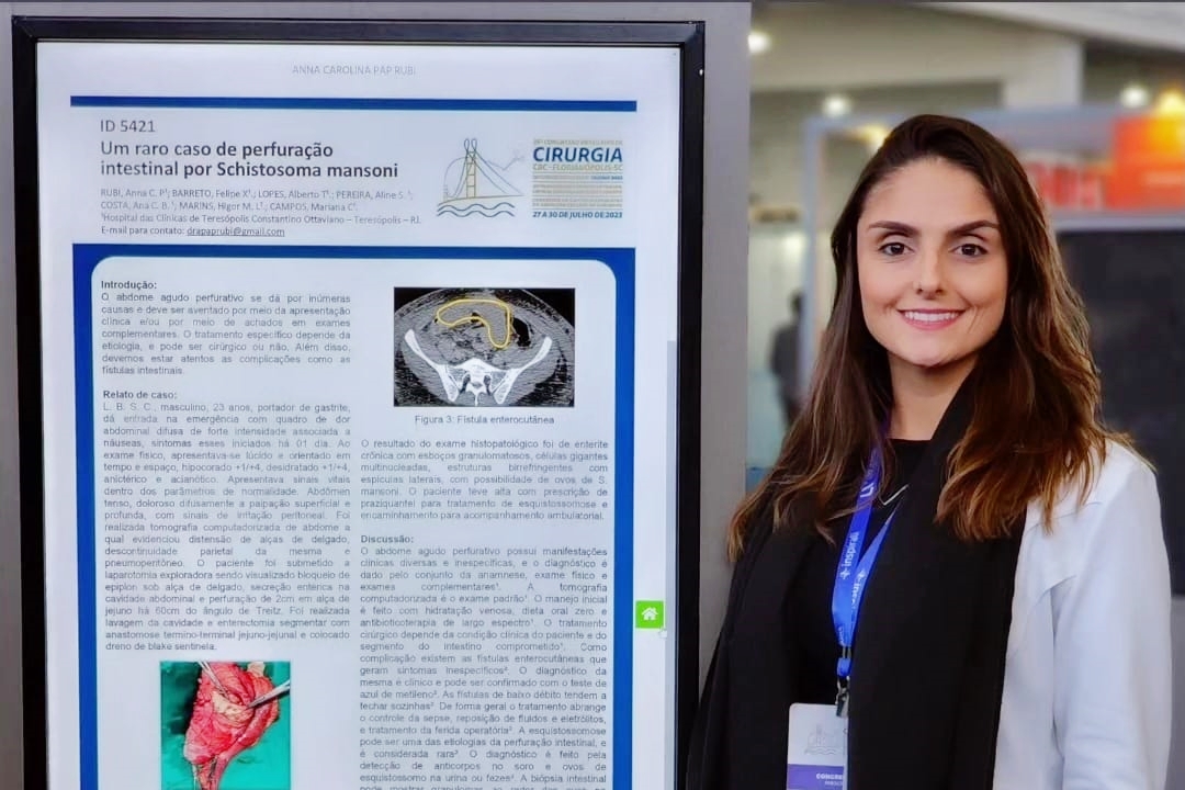 A Dra. Anna Carolina Pap Rubi expôs o trabalho “Um raro caso de Perfuração intestinal por Schistosoma mansoni”. Ela conta que foi a primeira vez que as três residentes participaram do congresso. “Conseguimos ter contato com técnicas cirúrgicas e com diferentes abordagens de cirurgias que realizamos e que não realizamos no Serviço do HCTCO. Conseguimos fazer um comparativo e trazer coisas novas para o nosso dia a dia, além do networking com cirurgiões de outros estados e países para trocar ideias sobre esses temas. O congresso abordou muito a parte abdominal, foi bastante enriquecedor”, explicou.