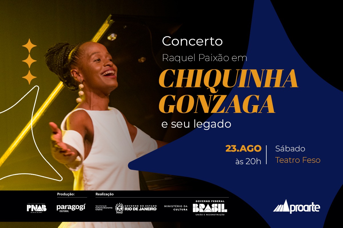 O Teatro Feso receberá neste sábado, 23 de agosto, o concerto “Chiquinha Gonzaga e seu levado”. O espetáculo será conduzido pela artista Raquel Paixão, que interpreta a personagem, revelando curiosidades e momentos decisivos de uma das vozes mais importantes na luta abolicionista.